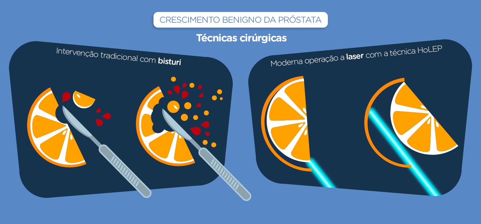 Há ainda o tratamento cirúrgico do crescimento benigno da próstata com laser, surgido há 20 anos. Atualmente, a enucleação endoscópica da próstata com o laser Holmium (HoLEP) se constitui o tipo de laser mais estudado para o tratamento desta doença.